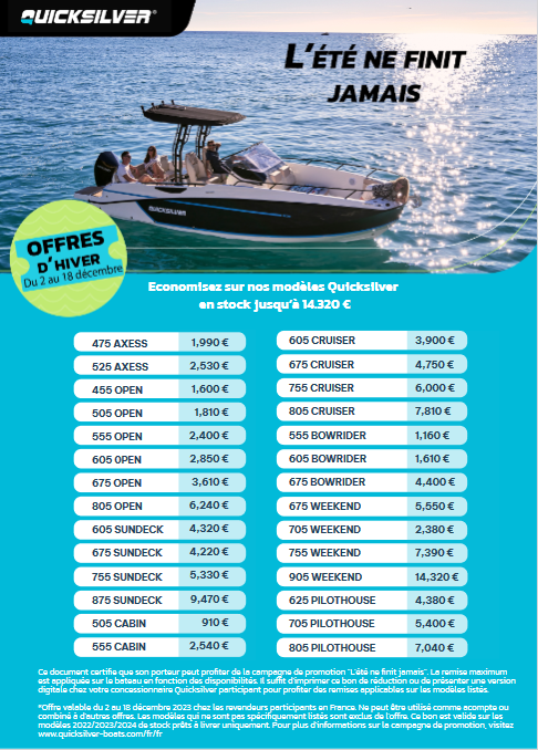 Venez profiter d’offres exceptionnelles de fin d’année sur un large choix de bateaux prêts à livrer de la gamme Quicksilver.